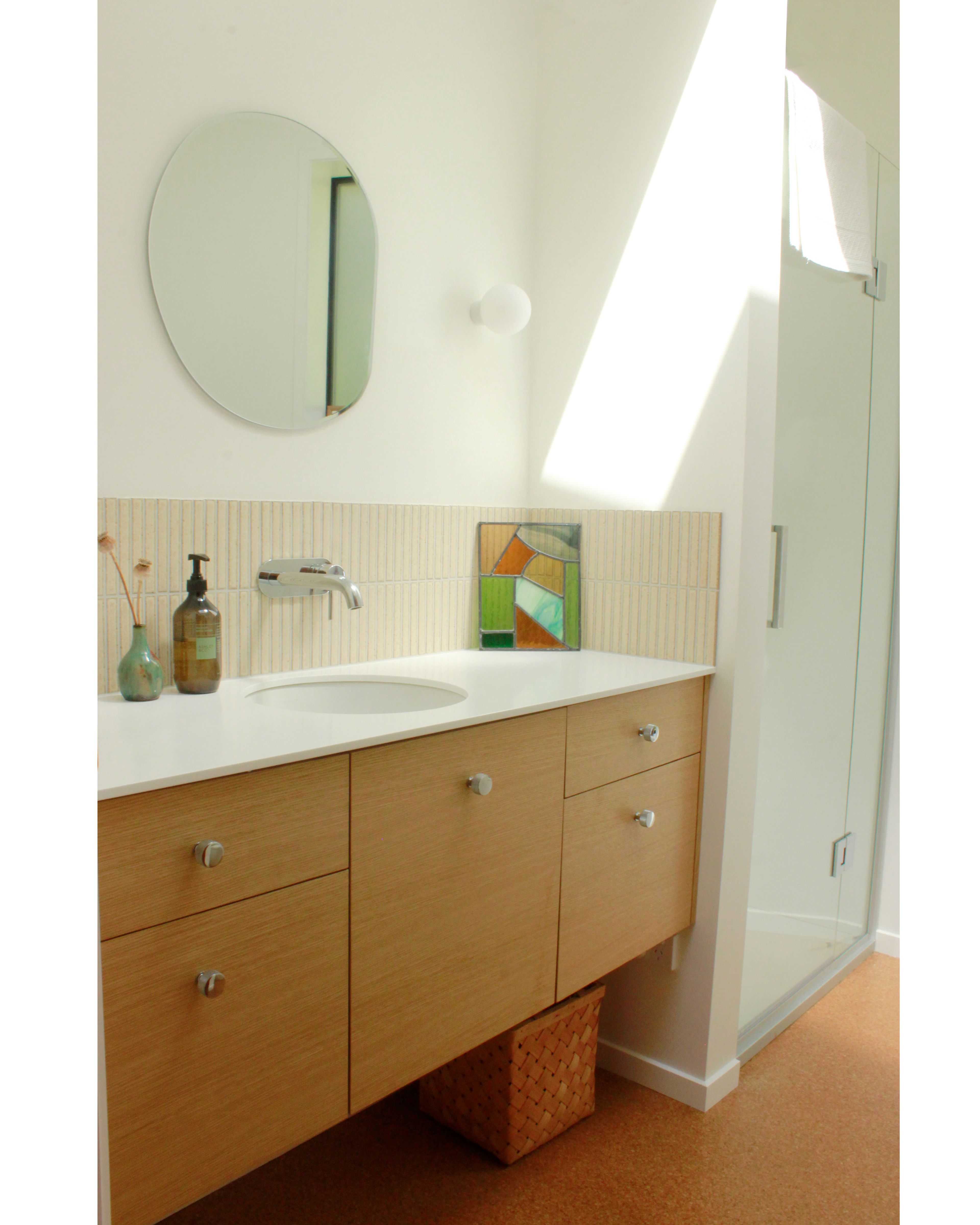 Floating alcove vanity with grain matched oak plywood for a new build in Laingholm, NZ